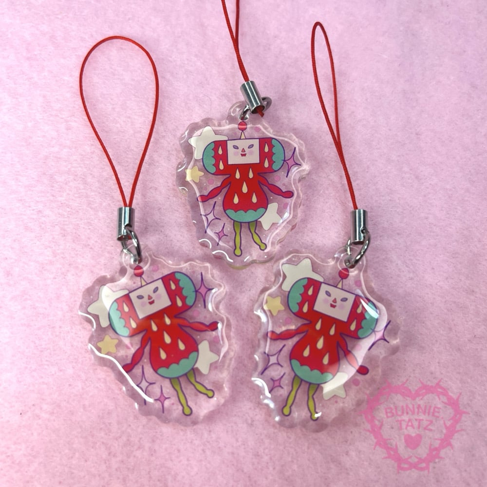 Acrylic charm with an epoxy top coat.